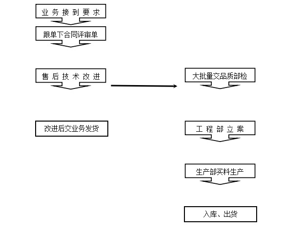 1)當業(yè)務部接到特殊訂單時,跟單根據業(yè)務員提供客戶的要求下《合同評審單》。交與售后,售后根據單據要求領料改進。小批量樣品改進檢測合格后,(10套以下)交業(yè)務部發(fā)給客戶。
