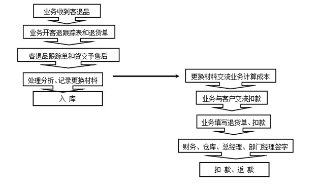 2)當業(yè)務部接待退貨物品后,填寫《客退品跟蹤單》和《退貨單》,《客退品跟蹤單》如同客退品一起交予售后進行分析處理。