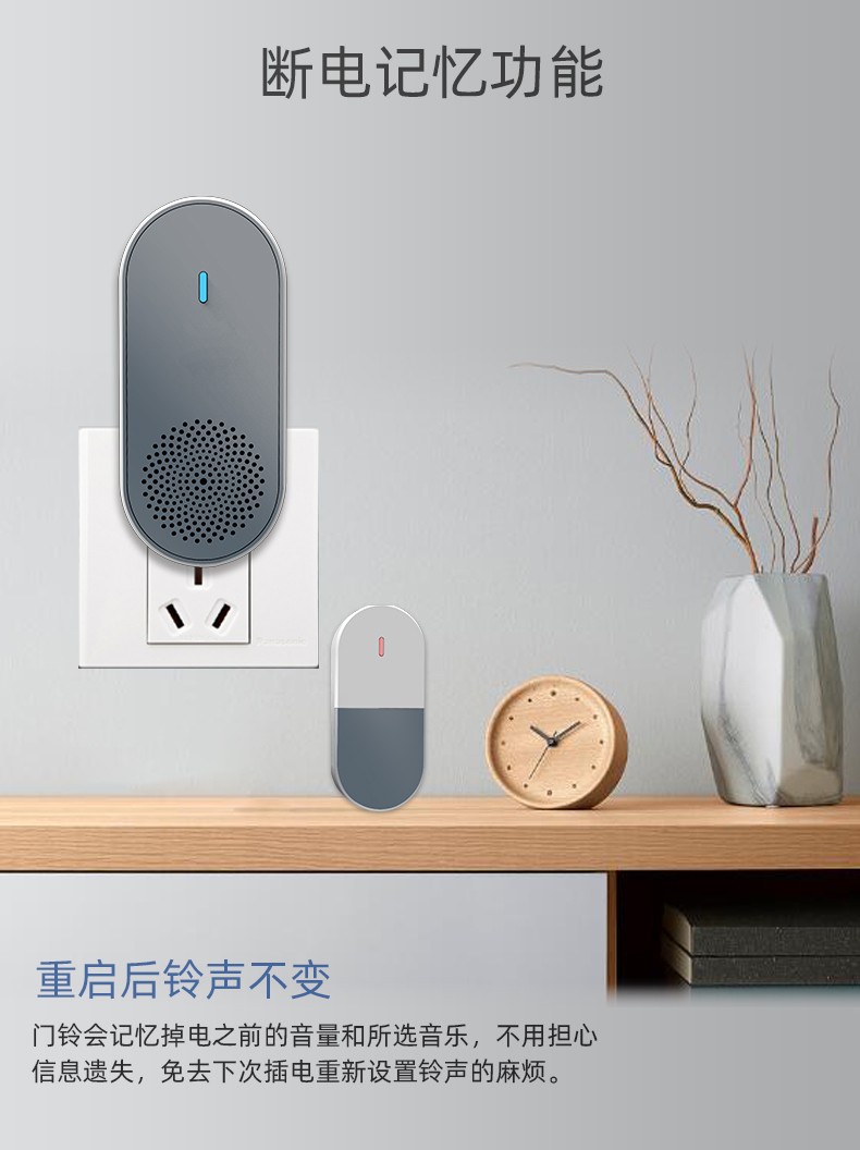 門鈴有掉電記憶功能,會(huì)記憶掉電之前的音量和所選音樂。不用擔(dān)心信息遺失。