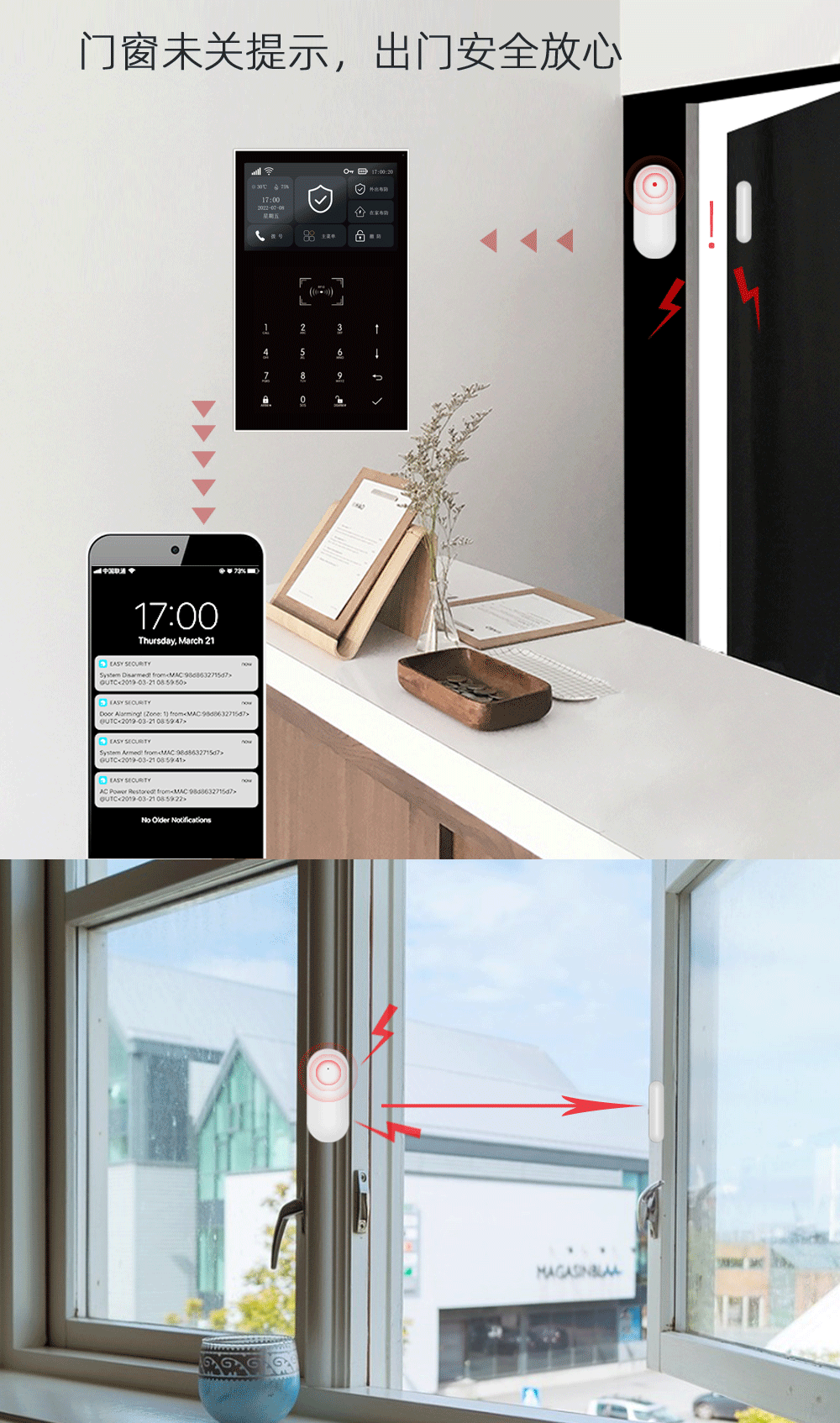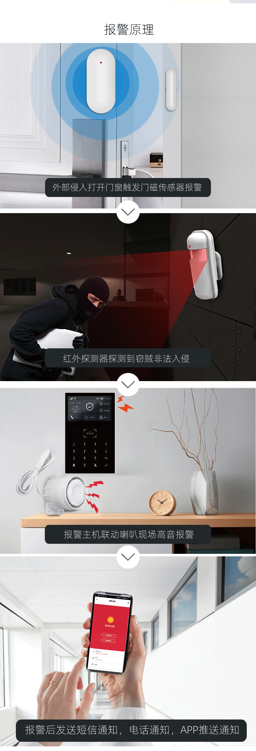 無線傳感器低電壓報(bào)警提醒;布防時(shí)門窗未關(guān)提示;