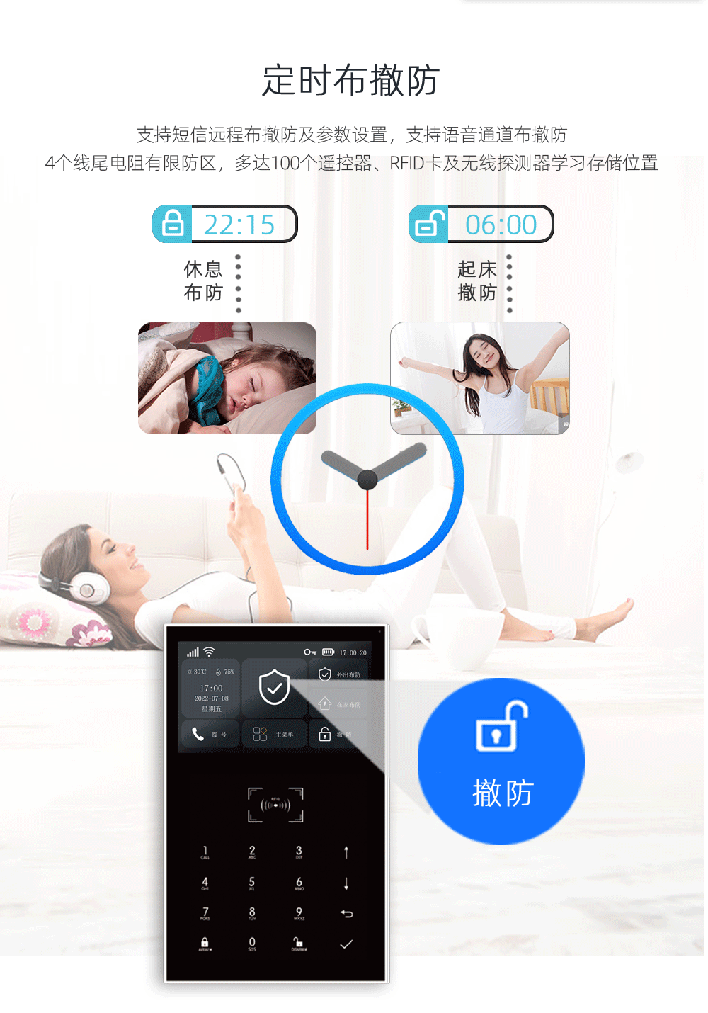 支持外出防區(qū)、在家防區(qū)、周界防區(qū),24小時(shí)防區(qū)、門鈴防區(qū)等多個(gè)防區(qū)類型設(shè)置;
