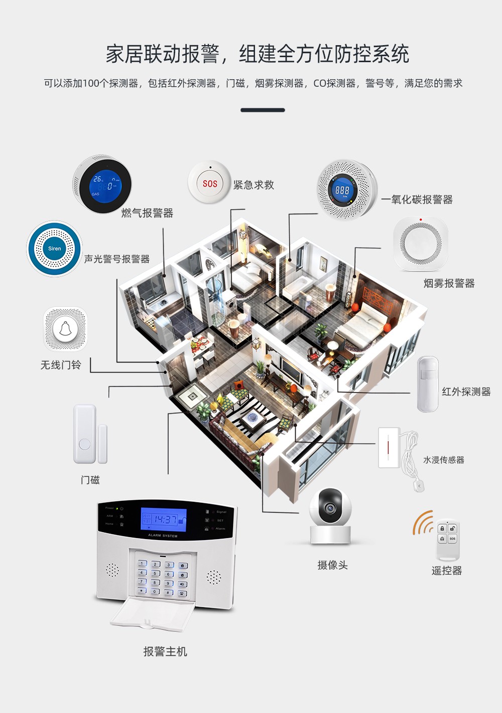 報(bào)警編程:求救、火災(zāi)、煤氣、大廳、窗戶、陽臺(tái)、周界;