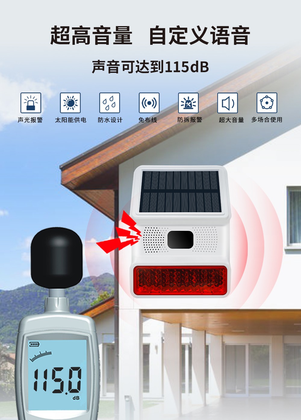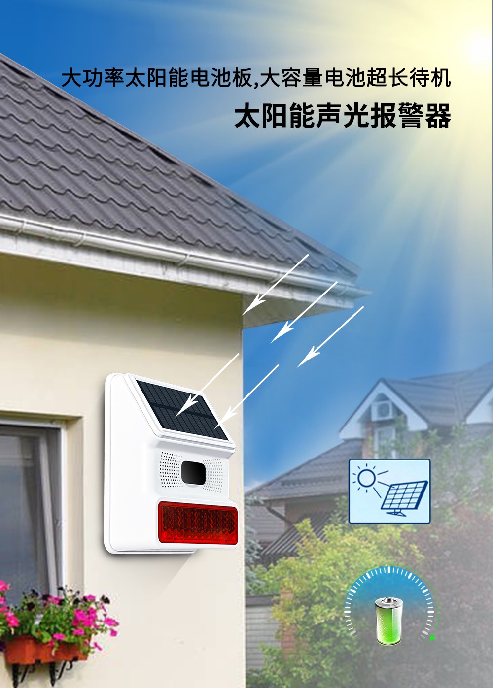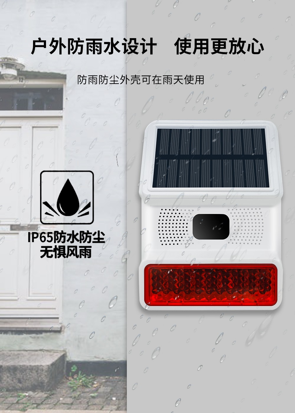 無(wú)線太陽(yáng)能紅外聲光報(bào)警器分為聯(lián)網(wǎng)型和RF型,探測(cè)距離8-12米,角度110度,這是一款可以自定義報(bào)警語(yǔ)音,高性能的帶太陽(yáng)能充電的戶外數(shù)字被動(dòng)紅外現(xiàn)場(chǎng)聲光報(bào)警器。能夠有效防水、防塵、防蟲(chóng)、防風(fēng)和其他戶外干擾因素。該產(chǎn)品應(yīng)用如下先進(jìn)技術(shù):超低功耗芯片技術(shù),WiFi聯(lián)網(wǎng)技術(shù),NB/4G無(wú)線通訊技術(shù),太陽(yáng)能持續(xù)充電和供電,音頻和高亮度閃燈同時(shí)報(bào)警提醒。使用穩(wěn)定、性能先進(jìn)、IP-65防水的整體結(jié)構(gòu)設(shè)計(jì),可以應(yīng)用于商鋪、別墅、養(yǎng)殖場(chǎng)、森林防火、高壓電桿、公園、倉(cāng)庫(kù)、碼頭等一切需要現(xiàn)場(chǎng)語(yǔ)音和強(qiáng)光警示的地方。