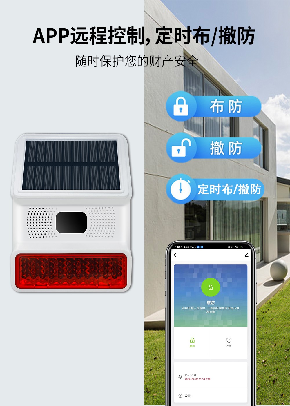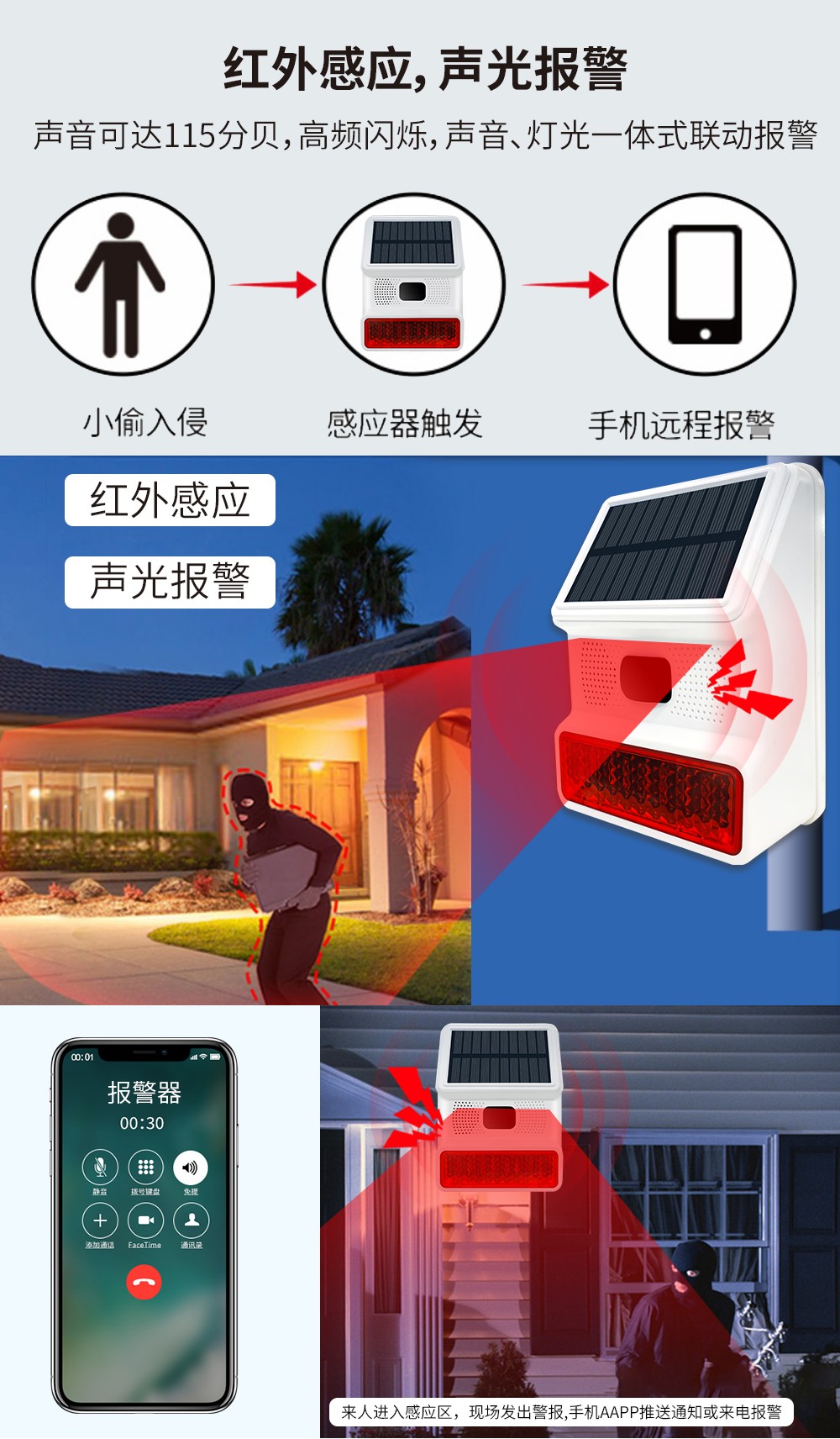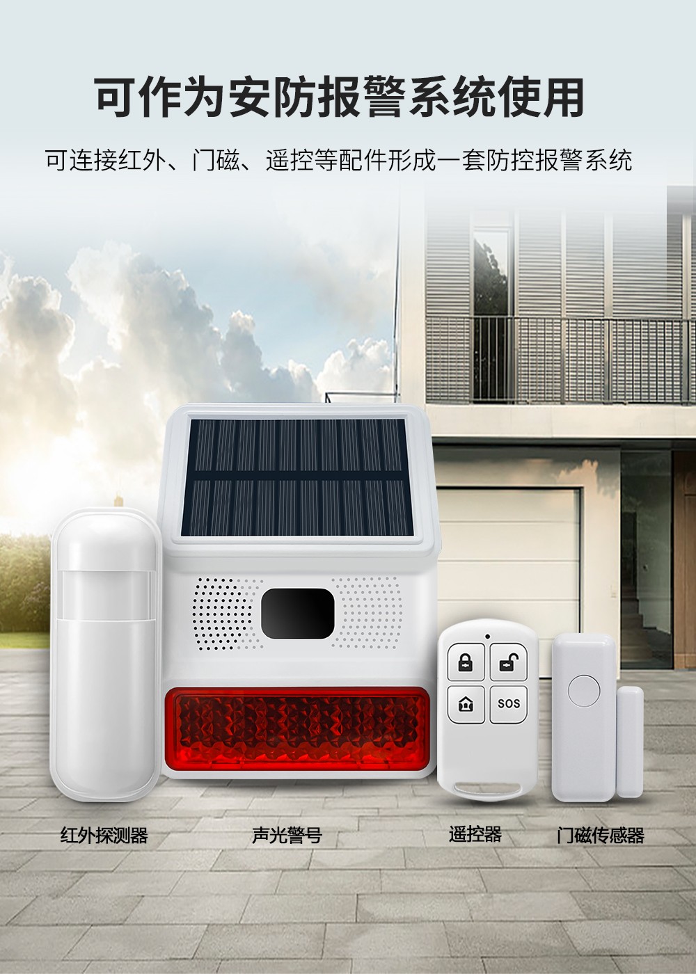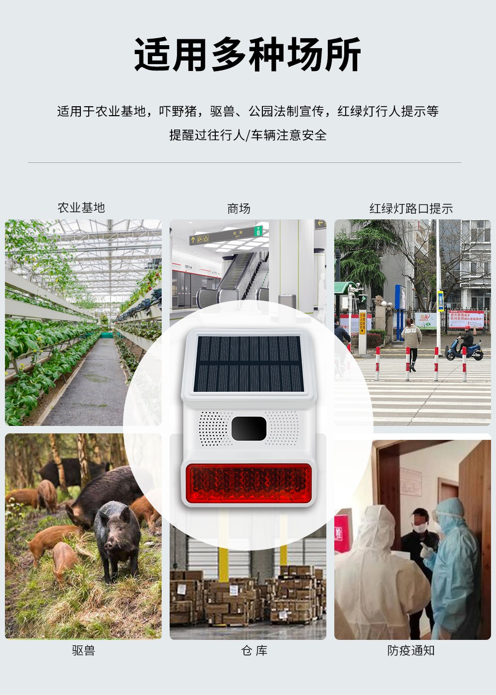 無(wú)線太陽(yáng)能紅外聲光報(bào)警器分為聯(lián)網(wǎng)型和RF型,探測(cè)距離8-12米,角度110度,這是一款可以自定義報(bào)警語(yǔ)音,高性能的帶太陽(yáng)能充電的戶外數(shù)字被動(dòng)紅外現(xiàn)場(chǎng)聲光報(bào)警器。能夠有效防水、防塵、防蟲(chóng)、防風(fēng)和其他戶外干擾因素。該產(chǎn)品應(yīng)用如下先進(jìn)技術(shù):超低功耗芯片技術(shù),WiFi聯(lián)網(wǎng)技術(shù),NB/4G無(wú)線通訊技術(shù),太陽(yáng)能持續(xù)充電和供電,音頻和高亮度閃燈同時(shí)報(bào)警提醒。使用穩(wěn)定、性能先進(jìn)、IP-65防水的整體結(jié)構(gòu)設(shè)計(jì),可以應(yīng)用于商鋪、別墅、養(yǎng)殖場(chǎng)、森林防火、高壓電桿、公園、倉(cāng)庫(kù)、碼頭等一切需要現(xiàn)場(chǎng)語(yǔ)音和強(qiáng)光警示的地方。
